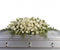 White funeral tribute created in a brass container Statement Arrangement elegant and soft.