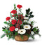 A gorgeous lush Christmas Centerpiece arrangement to sit beautifully on your table as a centerpiece. This beautiful arrangement is made with fresh greenery, red roses, filler flowers assorted Christmas greens and berries in a container. This is a perfect gift that requires no care. Candles included. Each design is specifically designed, no arrangement will look exactly the same.