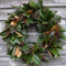 Beautiful Holiday centrepiece filled with two candles, assorted green greenery, white flowers including lisianthus, carnations, berries, status and eucalyptus
