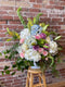 A stunning mixed bouquet including 1 large king protea and an assortment of 8 red and pink roses and greenery.