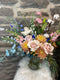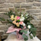 A soft mix of light roses, a fresh variety of greens filled with lisianthus, berries and Veronica ,a mix of beautiful dried flowers and fillers to create a simple statement in a white container.