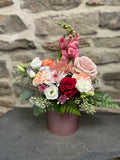 A beautiful rose gold box filled with an assortment of fresh vibrant flowers! Included roses, snapdragon, tulip, daisys, and assorted filler flowers.